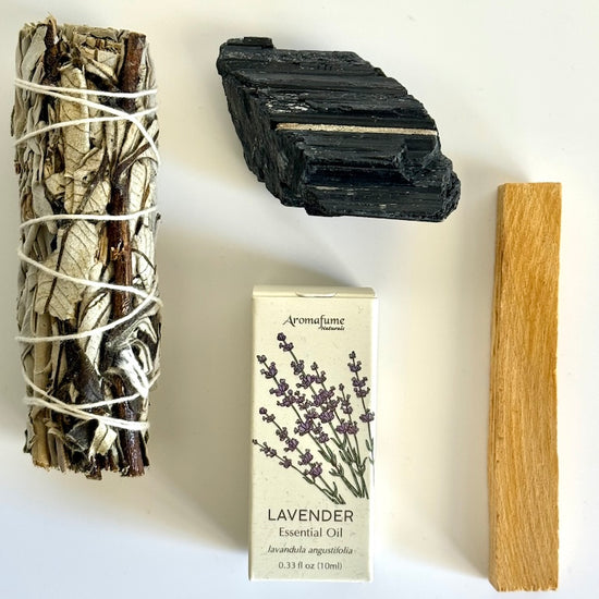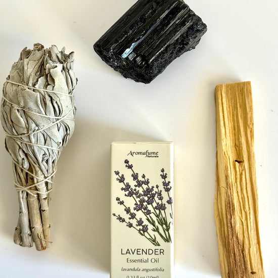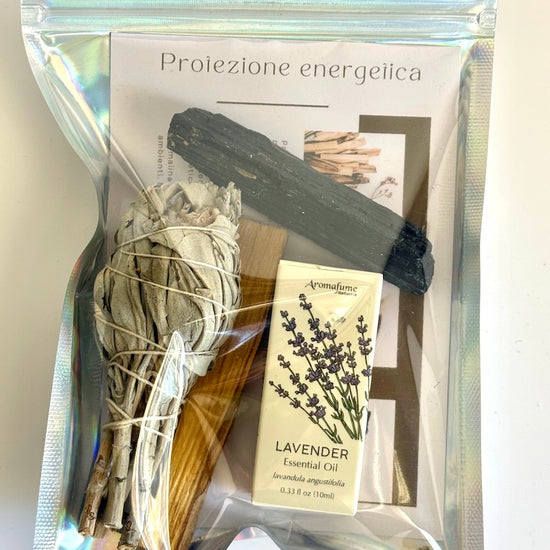 Kit Protezione energetica con Tormalina nera, Smudge alla Salvia bianca e lavanda, Olio essenziale Protection e Palo santo
