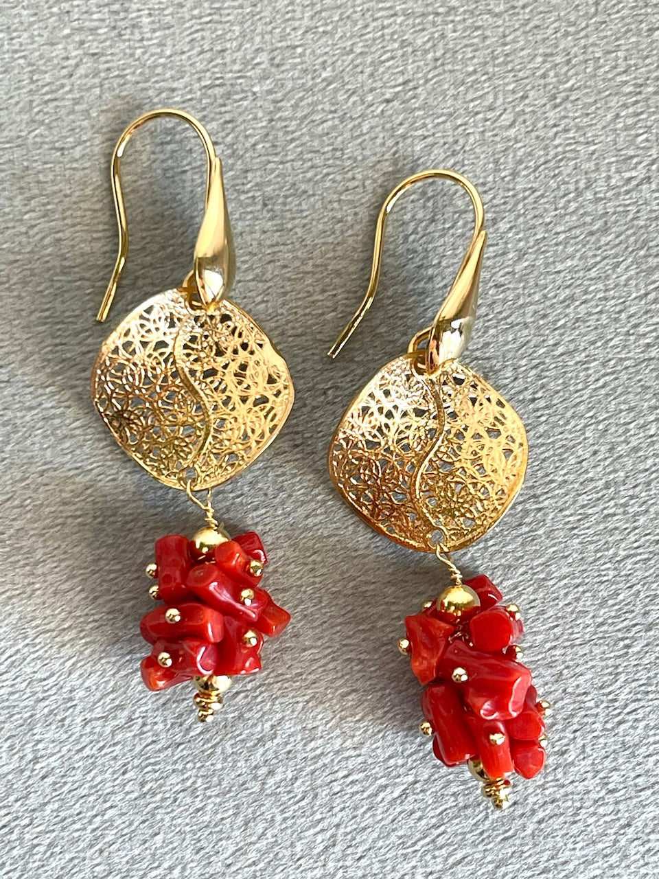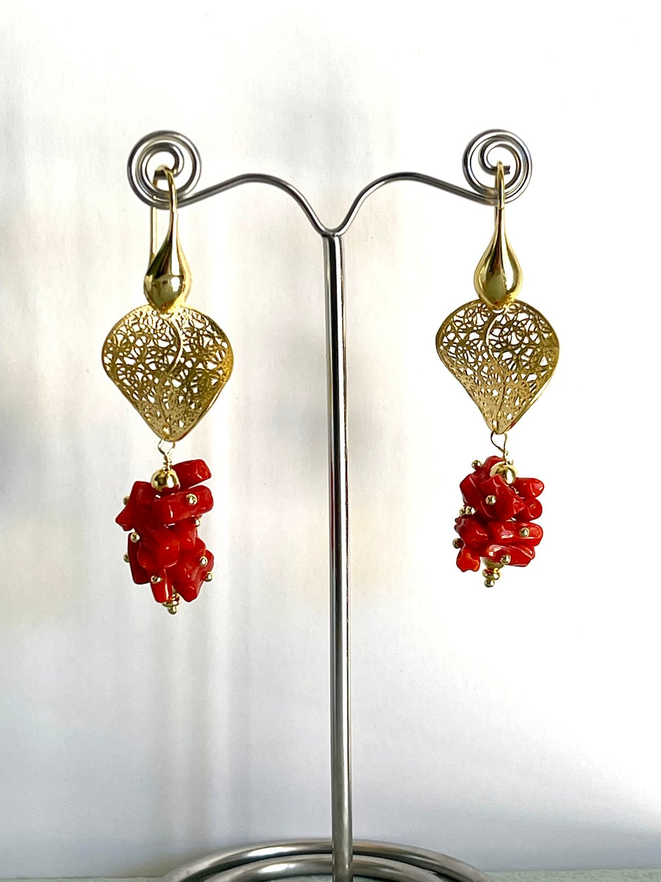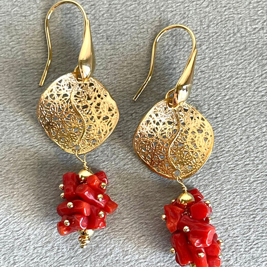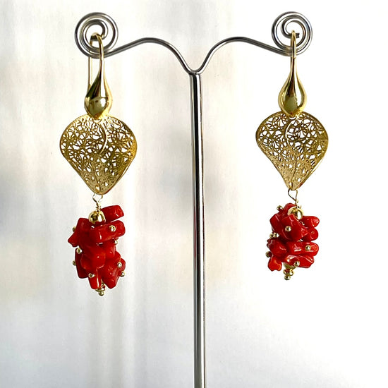 Orecchini realizzati in argento 925 dorato con cips di Corallo rubrum.